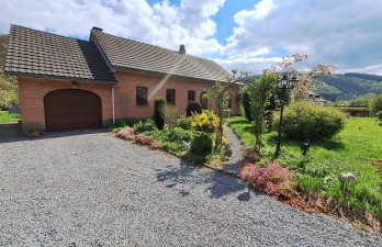 Une allée privée vous amène à cette maison de bonne structure (1998) niché dans un magnifique terrain arboré de 5.750m². Dans un très bon état général, les pièces de vie présentent une configuration agréable dans un plein pied. Le REZ est composé d’un hall d’entrée (16m²) accueillant avec volume ouvert et mezzanine, une cuisine (13.30m²) semi- équipée avec accès à la terrasse et au jardin. Le séjour (28m²) très lumineux avec feu ouvert- K7. Le hall de nuit désert le WC, 2 chambres (13,30m²), dont une petite (6m²) pouvant servir comme bureau, la salle de bain (6m²) équipée d’une baignoire/ douche et dbl évier. Au fond du couloir accès intérieur au grand garage. A l’Etage : le palier ouvert, 1 chambre, 1 gr pièce (pt travaux de finitions) et le grenier. Le bien est idéalement orienté sud-est. TECNIQUE : toute la boiserie intérieure est en chêne massif, porte de garage automatique, CC mazout et cheminée avec K7, une source d’eau située dans le jardin est raccordée sur le WC, robinetterie ext. et garage. DV, installation électrique non conforme. La maison est directement habitable ! Trou de Bra fait partie de la commune de Lierneux situé en Haute Ardenne. Habiter en pleine nature, profiter d’un terrain spacieux avec ses nombreux arbres fruitiers, un potager, une petite mare d’eau et un abri de jardin. PEB : n°2023, C/243 kwh/m².an, totale 51207kWh/an. Demandez des informations détaillées via info@immoge.com Lia Ploumen